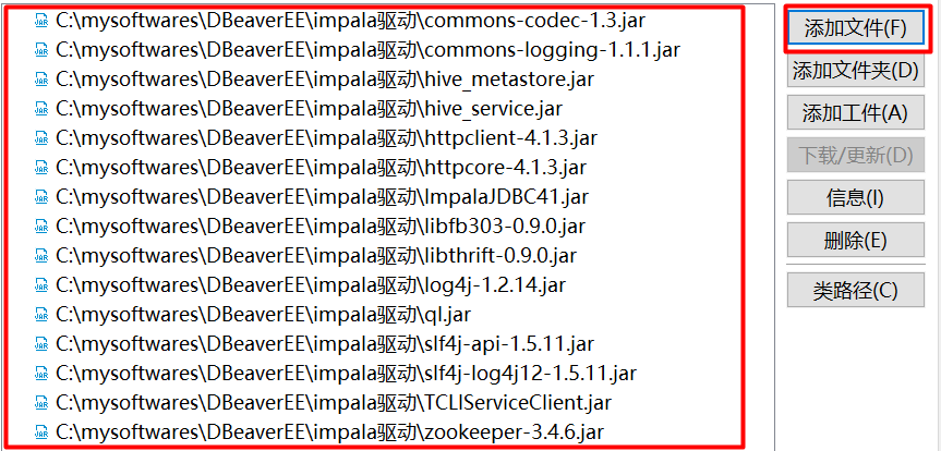 第四步,编辑驱动配置,与Hive的配置一样,选择相对应的驱动jar包,并添加。关于jar包的下载,可以在Cloudera官网进行下载[https://www.cloudera.com/downloads/connectors/impala/jdbc/2-5-41.html],本文使用的是 ImpalaJDBC41.jar