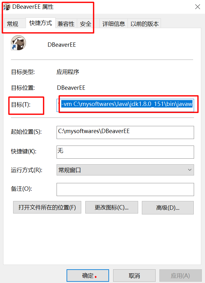 尖叫提示:我使用的版本是DBeaverEE6.0,需要在快捷方式的属性中重新配置java路径,否则会报错。具体配置为:在属性后面添加java的目录,-vm C:\mysoftwares\Java\jdk1.8.0_151\bin\javaw