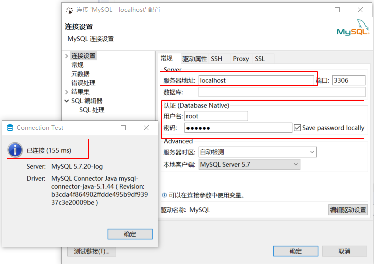 第二步,下载驱动。点击之后,需要下载MySQL的驱动,可以点击驱动属性进行下载,填好服务器地址、用户名和密码之后测试连接: