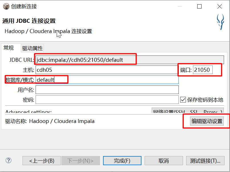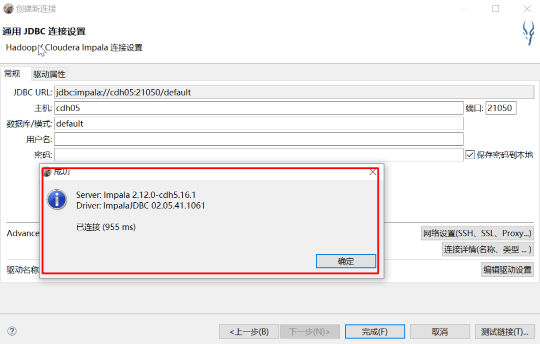 第三步,填写好url,端口号默认是21050,该端口被使用 JDBC 或 Cloudera ODBC 2.0 及以上驱动的诸如 BI 工具之类的应用用来传递命令和接收结果,关于Impala的各端口的解释说明,可以参考我的另一篇文章: Impala使用端口号汇总。如下图: