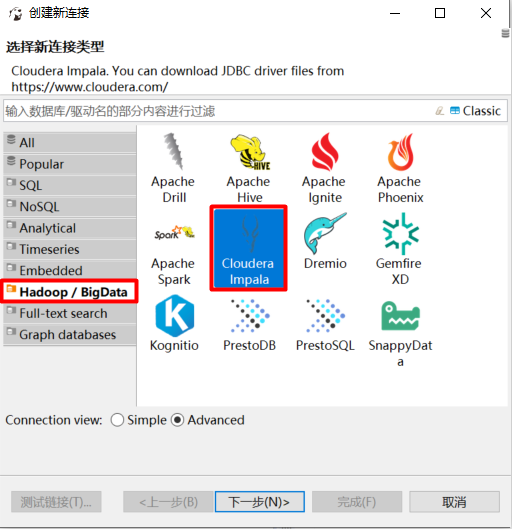 第二步,选择Hadoop/Bigdata,选择Cloudera Impala,然后点击下一步,如下: