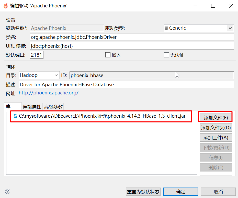 第三步,编辑驱动设置,把Phoenix安装目录下的 phoenix-4.14.3-HBase-1.3-client.jar文件复制到本地的一个文件下,并且把hbase-site.xml文件添加到该jar包中,然后选择添加文件,选择该jar包。