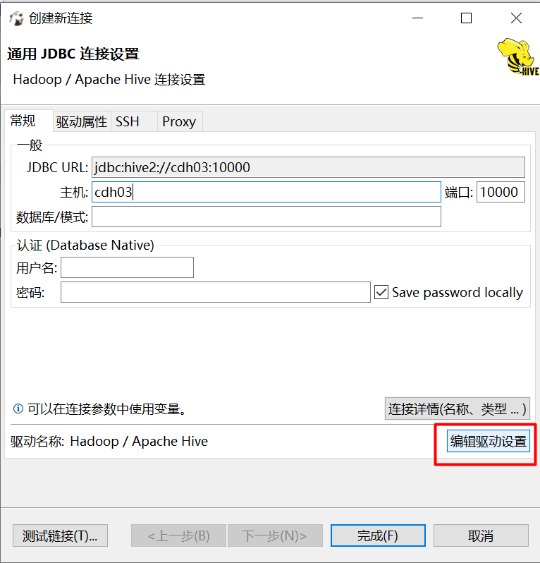 尖叫提示:如果选择自动下载驱动,会出现版本不兼容或者下载失败的情况,所以不建议使用这种方式。最简单的方式是将hive JDBC的jar包直接加载进去即可,本文使用的Hive是CDH5.16的hive1.1.0版本,在/opt/cloudera/parcels/CDH/lib/hive/lib目录下找到hive-jdbc-1.1.0-cdh5.16.1-standalone.jar文件,将其放在本地的一个文件夹下(可以放置在DBeaver的安装目录下),然后选择编辑驱动设置:如下图