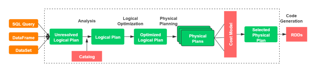 注意:在物理计划阶段,Catalyst会生成多个计划,并且会计算每个计划的成本,然后比较这些计划的成本的大小,即基于成本的策略。在其他阶段,都是基于规则的的优化策略。