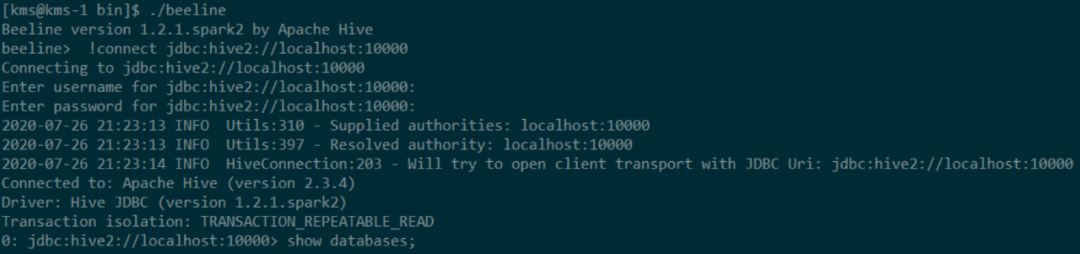 使用beeline访问JDBC/ODBC服务器,Beeline会要求提供用户名和密码,在非安全模式下,只需输入用户名和空白密码即可