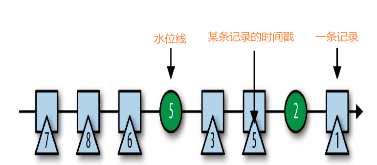 如上图,矩形表示一条记录,三角表示该条记录的时间戳(真实发生时间),圆圈表示水位线。可以看到上面的数据是乱序的,比如当算子接收到为2的水位线时,就可以认为时间戳小于等于2的数据都已经到来了,此时可以触发计算。同理,接收到为5的水位线时,就可以认为时间戳小于或等于5的数据都已经到来了,此时可以触发计算。
