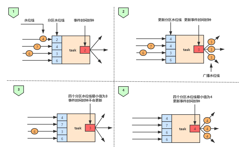 如上图,一个任务会为它的每个分区都维护一个分区水位线(partition watermark),当收到每个分区传来的水位线时,任务首先会让当前分区水位线的值与接收的水位线值相比较,如果新接收的水位线值大于当前分区水位线值,则会将对应的分区水位线值更新为较大的水位线值(如上图中的2步骤),接着,任务会把事件时钟调整为当前分区水位线值的最小值,如上图步骤2 ,由于当前分区水位线的最小值为3,所以将事件时间时钟更新为3,然后将值为3的水位线广播到下游任务。步骤3与步骤4的处理逻辑同上。