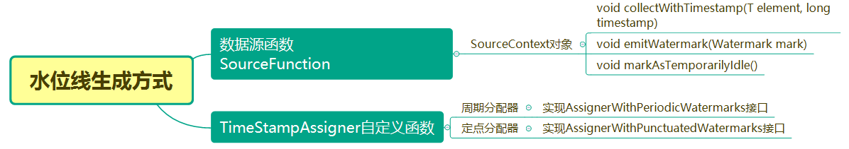 通常情况下,在接收到数据源之后应该马上为其生成水位线,即越靠近数据源越好。Flink提供两种方式生成水位线,其中一种方式为在数据源完成的,即利用SourceFunction在应用读入数据流的时候分配时间戳与水位线。另一种方式是通过实现接口的自定义函数,该方式又包括两种实现方式:一种为周期性生成水位线,即实现AssignerWithPeriodicWatermarks接口,另一种为定点生成水位线,即实AssignerWithPunctuatedWatermarks接口。具体如下图所示: