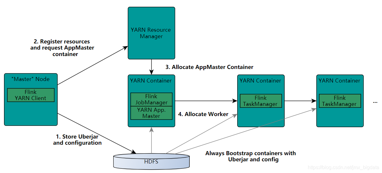 stop4:AM开始为Flink的TaskManagers分配容器,将从HDFS下载jar文件和修改后的配置。完成这些步骤后,可以接受jobs。