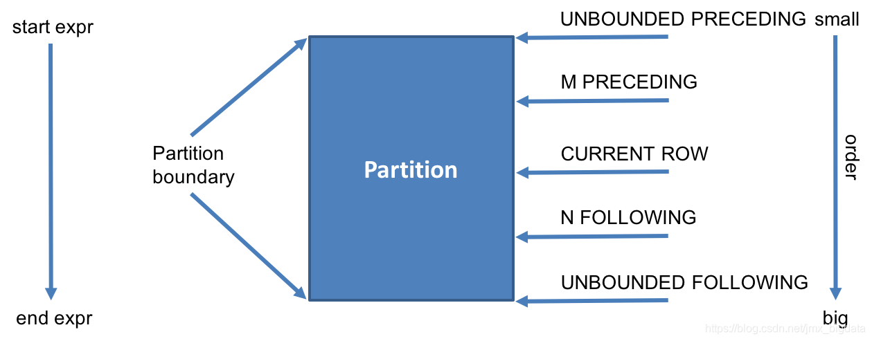 •n PRECEDING m FOLLOWING: 表示窗口的范围是:[(当前行的行数)- n, (当前行的行数)+m]