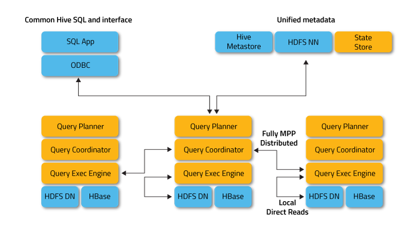 Impala server 是一个分布式的大规模并行处理(MPP)的数据库引擎, 它由运行在集群中特定主机上的不同守护进程组成。其架构图如下图所示: