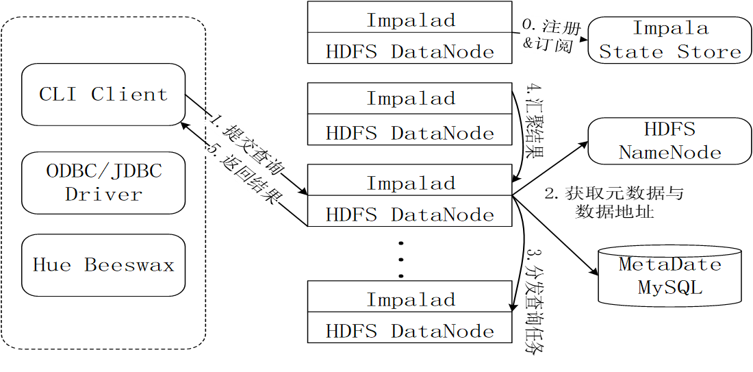 第0步,当用户提交查询前,Impala先创建一个负责协调客户端提交的查询的Impalad进程,该进程会向Impala State Store提交注册订阅信息,State Store会创建一个statestored进程,statestored进程通过创建多个线程来处理Impalad的注册订阅信息。