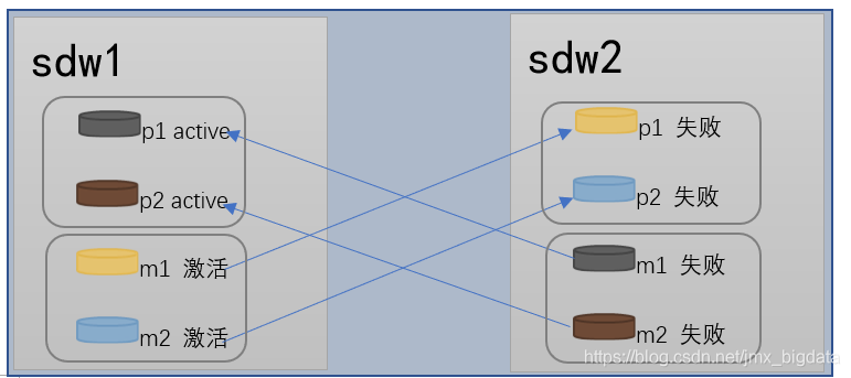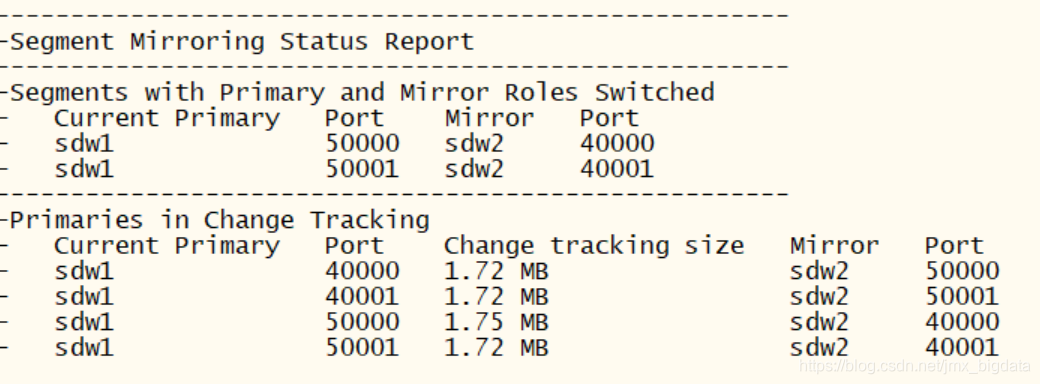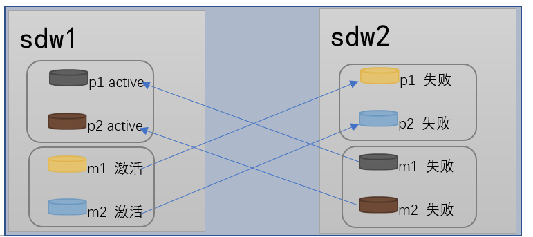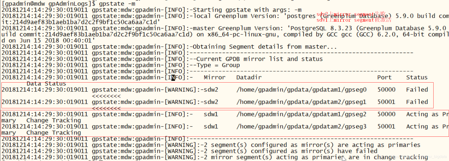 Sdw1节点primary segment正常,mirror segment被激活,其mirror segment为sdw2节点上的primary segment备份。Sdw2节点primary segment失败,mirror segment失败。此时集群环境能够正常提供服务,全部负载到sdw1节点上。