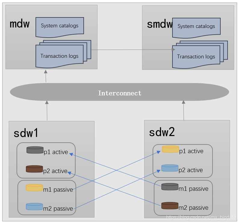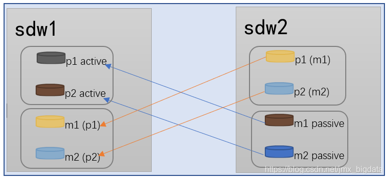 该生产环境集群由四台服务器构成,其中一台为primary master节点,一台为standby master节点,两外两台为segment节点,每个segment节点有四个segment(两个primary segment,两个mirror segment),segment采用group方式进行备份(sdw1的备份都在sdw2上,sdw2的备份都在sdw1上),其角色分配如下图所示: