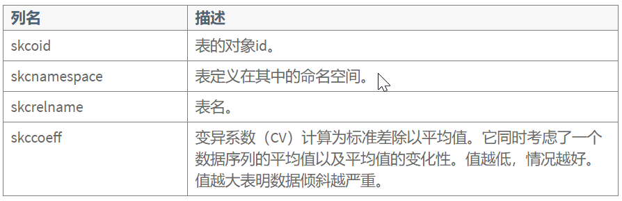 该视图通过计算存储在每个Segment上的数据的变异系数(CV)来显示数据分布倾斜。该视图能够被所有用户访问,但是非超级用户只能看到他们有权访问的表。