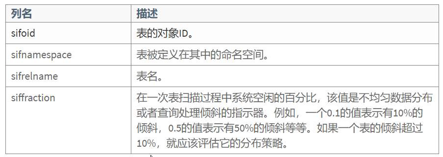 该视图通过计算在表扫描过程中系统空闲的百分比来显示数据分布倾斜,这是一种数据处理倾斜的指示器。该视图能够被所有用户访问,但是非超级用户只能看到他们有权访问的表。