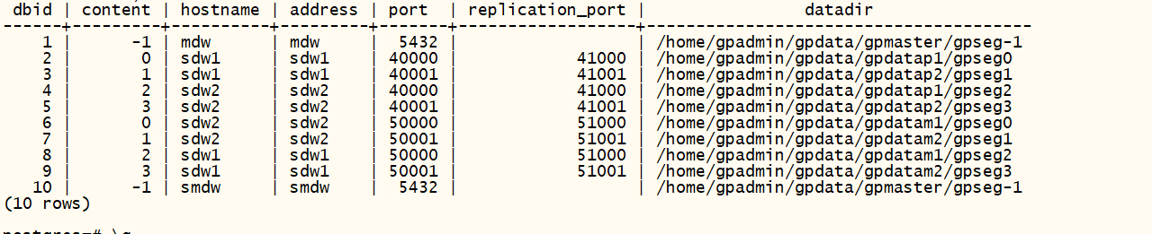 | =# SELECT dbid, content, hostname, address, port, replication_port, fselocation as datadir FROM gp_segment_configuration, pg_filespace_entry WHERE dbid=fsedbid ORDER BY dbid; |