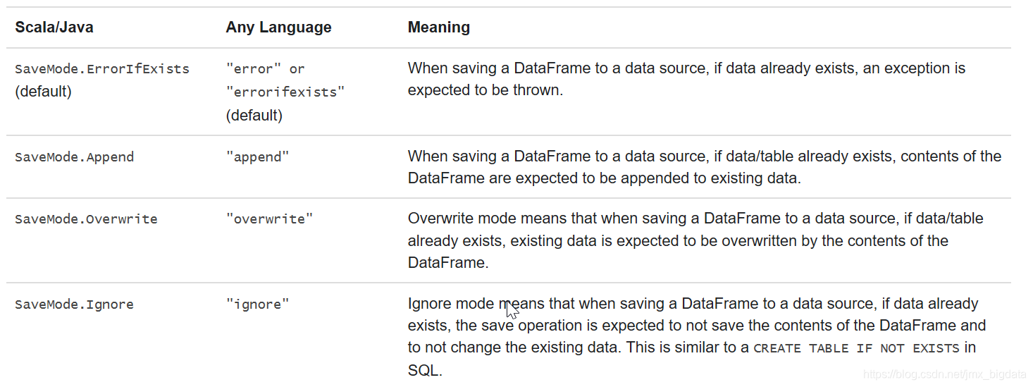 保存操作可以选择使用saveMode的参数,该saveMode主要是指定在保存数据存在的情况下,以什么方式处理保存的数据。