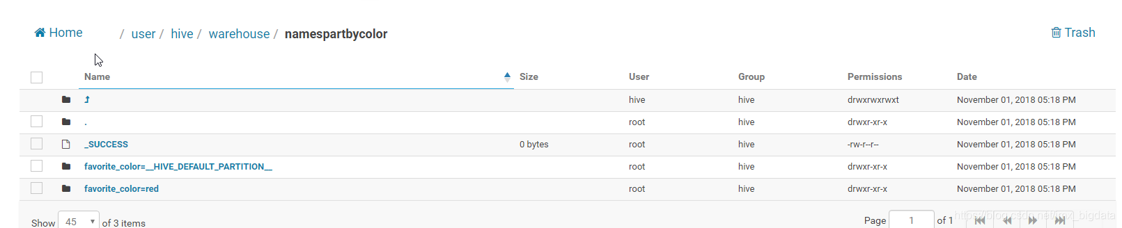 当使用DataSet的API时,对于save和saveAsTable而言,都可以使用分区 ,下面的第一条代码会在HDFS上的当前用户路径下产生一个文件夹namesPartByColor.parquet,里面包含了两个分区文件夹。第二条代码会在/user/hive/warehouse/namespartbycolor产生一个分区表。(下面两幅图为hue中的截图)