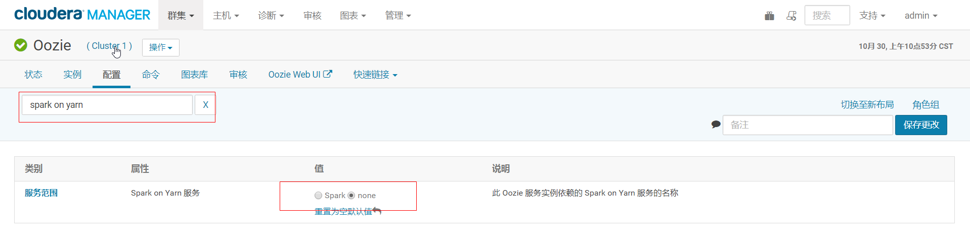 通过cloudera manager修改oozie的配置Spark on Yarn,将其值修改为none,保存配置。