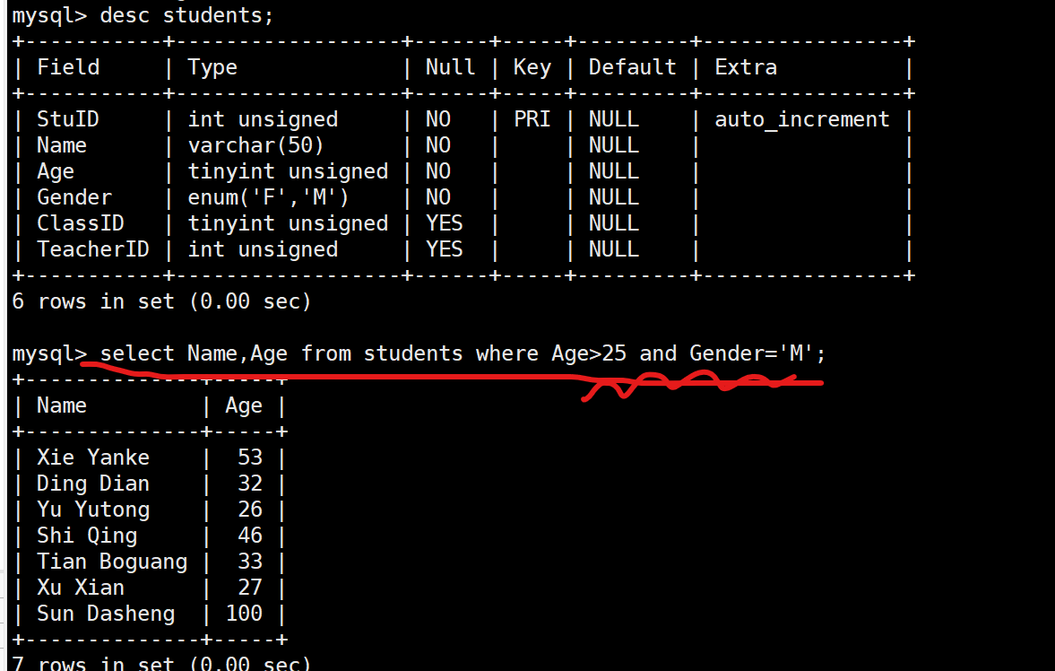 (1) 在students表中,查询年龄大于25岁,且为男性的同学的名字和年龄