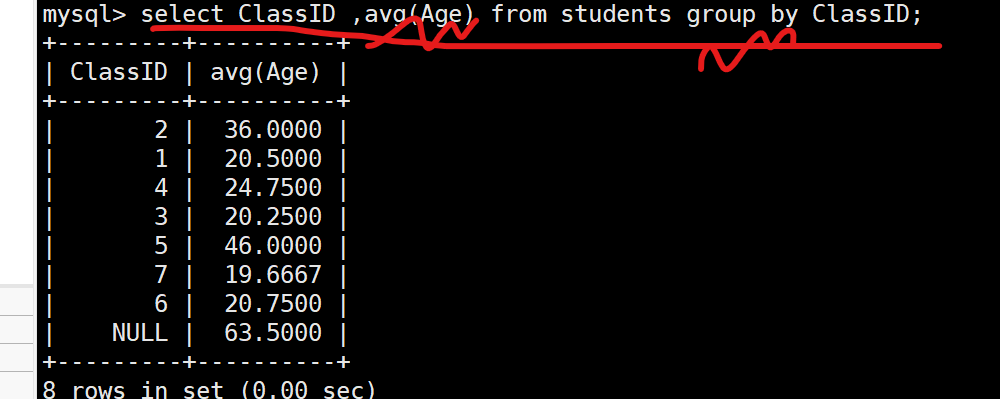 (2) 以ClassID为分组依据,显示每组的平均年龄