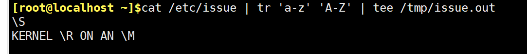 cat /etc/issue | tr 'a-z' 'A-Z' | tee /tmp/issue.out