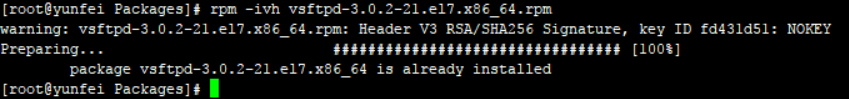 4. 输入rpm -ivh vsftpd-3.0.2-21.el7.x86_64.rpm,安装vsftpd服务: