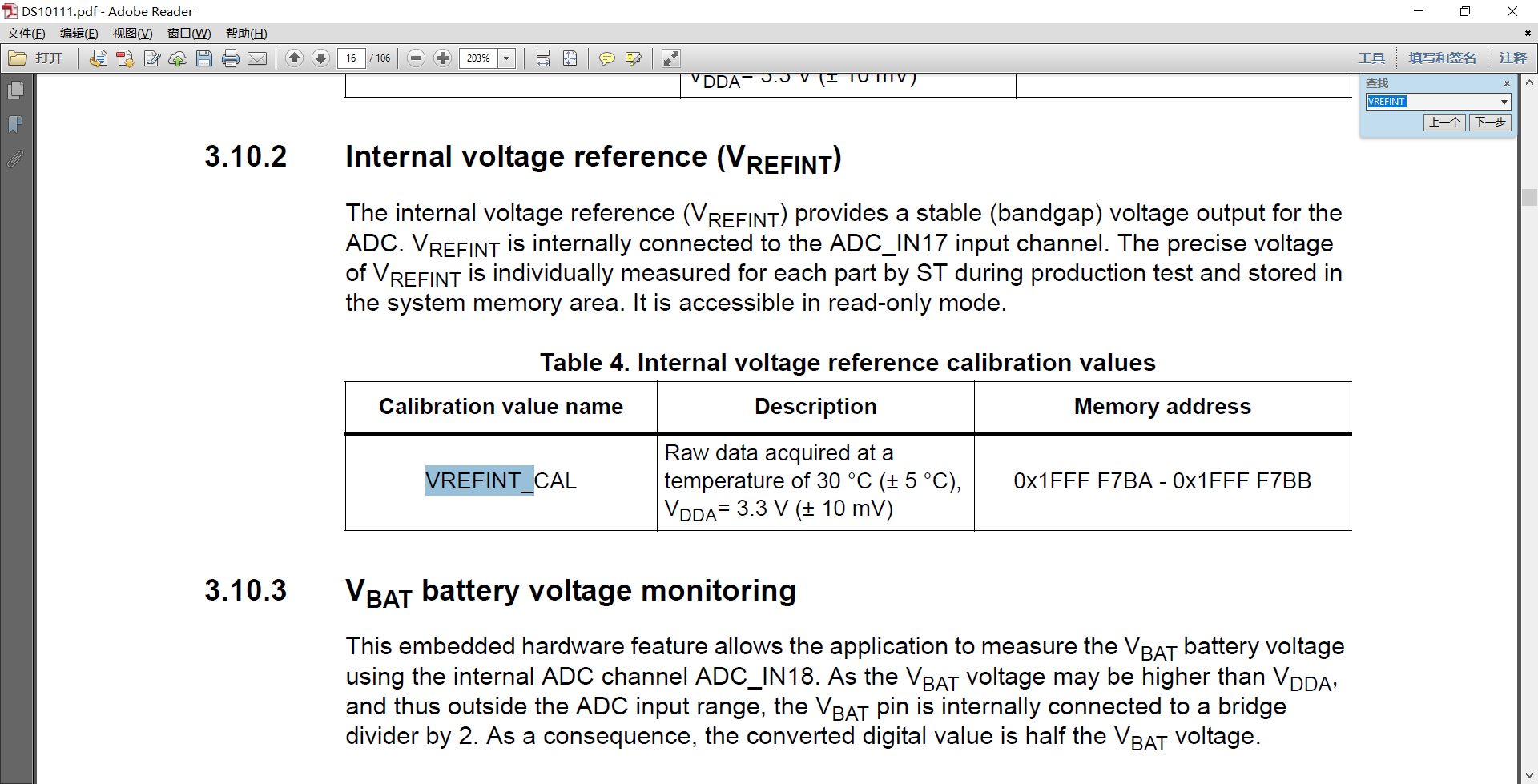 然后把这个测量的adc读数放在了0x1FFF F7BA - 0x1FFF F7BB里边