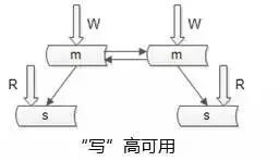 实际中没有使用上述两种架构来做读写的“高可用”,采用的是“双主当主从用”的方式: