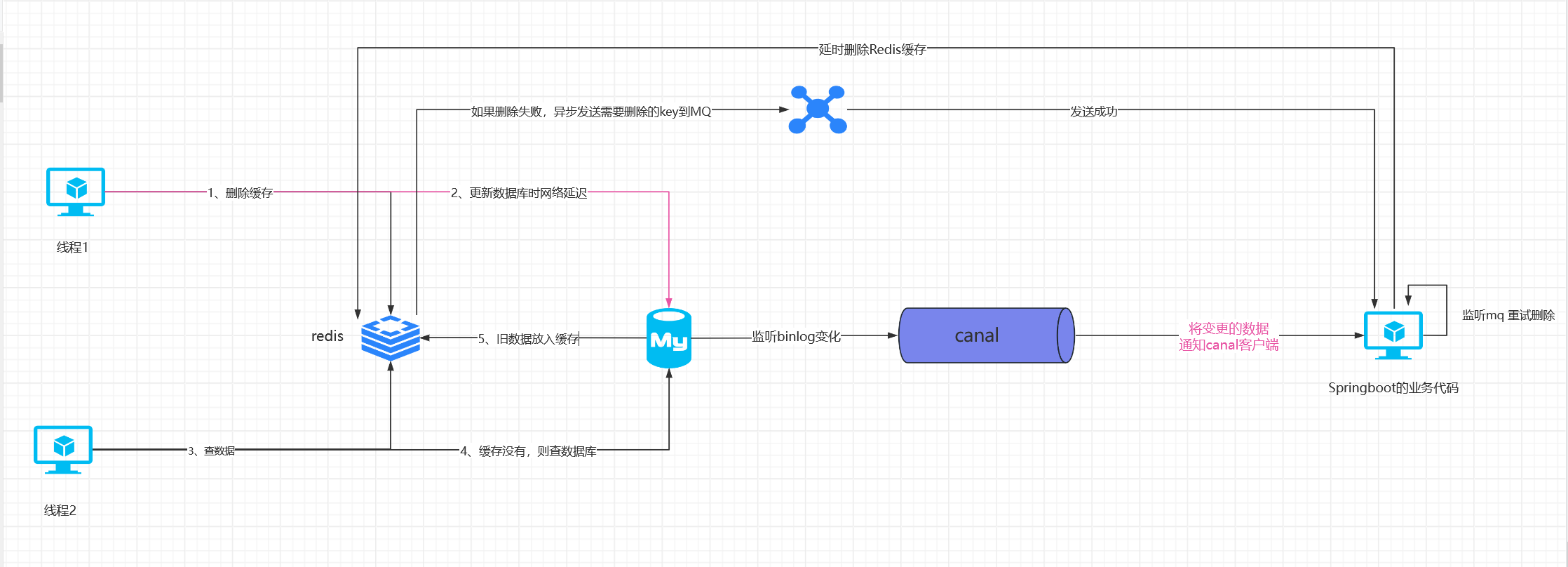 可以用一个服务(比如阿里的 canal)去监听数据库的 binlog日志,获取需要操作的数据。然后通过 Springboot业务代码 订阅程序传来的信息,进行缓存删除操作。