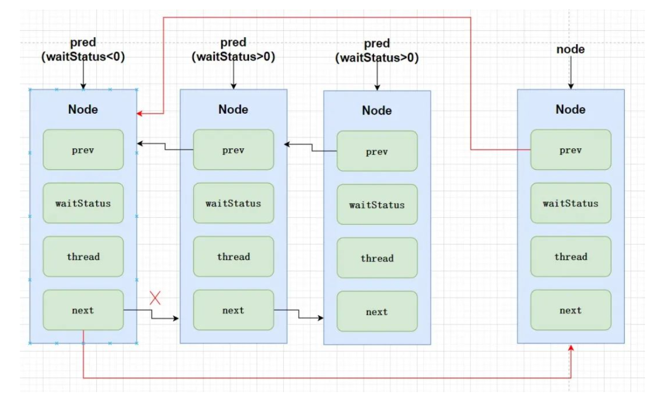 执行到while时找到前驱节点中最近的有效节点,把当前节点node挂到有效节点后边,可以过滤掉当前节点前的失效节点。声明出有效节点的第一个后继无效节点predNext,并把当前的node节点状态设置为失效状态。