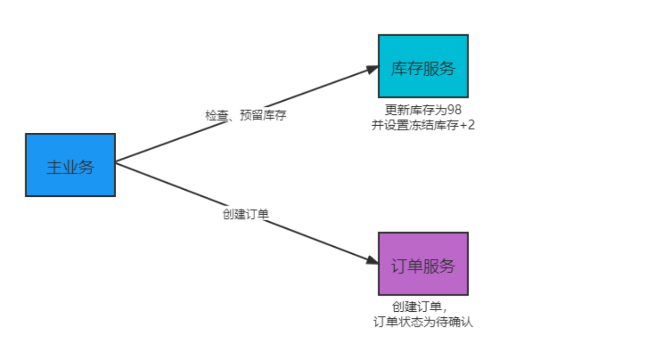 为了方便理解,下面以电商下单为例进行方案解析,这里把整个过程简单分为扣减库存,订单创建 2 个步骤,库存服务和订单服务分别在不同的服务器节点上。