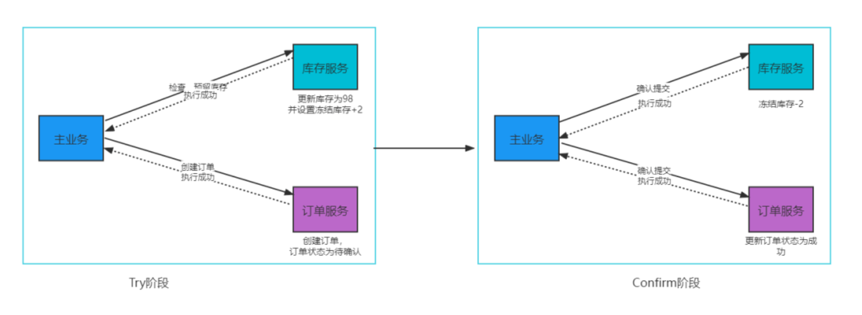Confirm:当 Try 阶段服务全部正常执行, 执行确认业务逻辑操作,业务如下图: