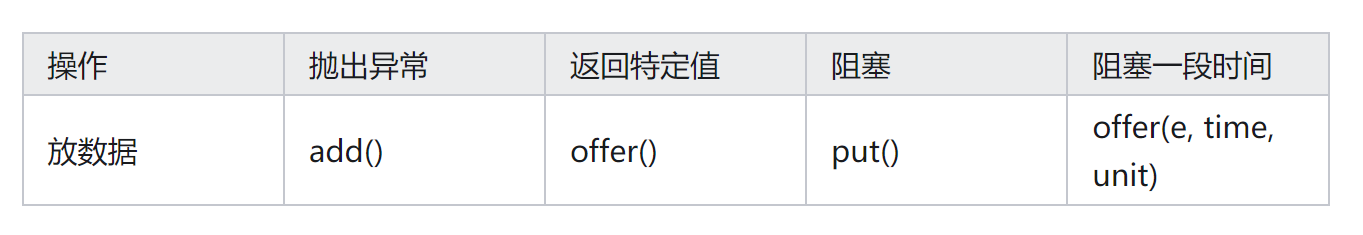1、ArrayBlockingQueue实现了BlockingQueue接口,提供了四组放数据和读数据的方法,来满足不同的场景
