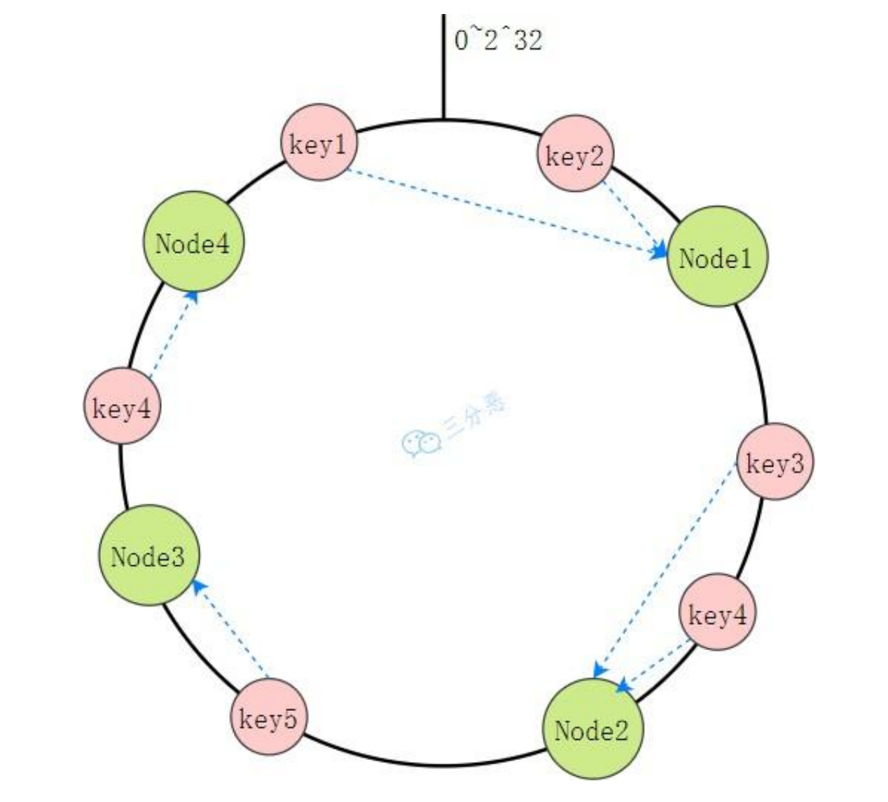 然后按照顺时针方向在环上“行走”,遇到的第一个缓存节点就是要访问的节点