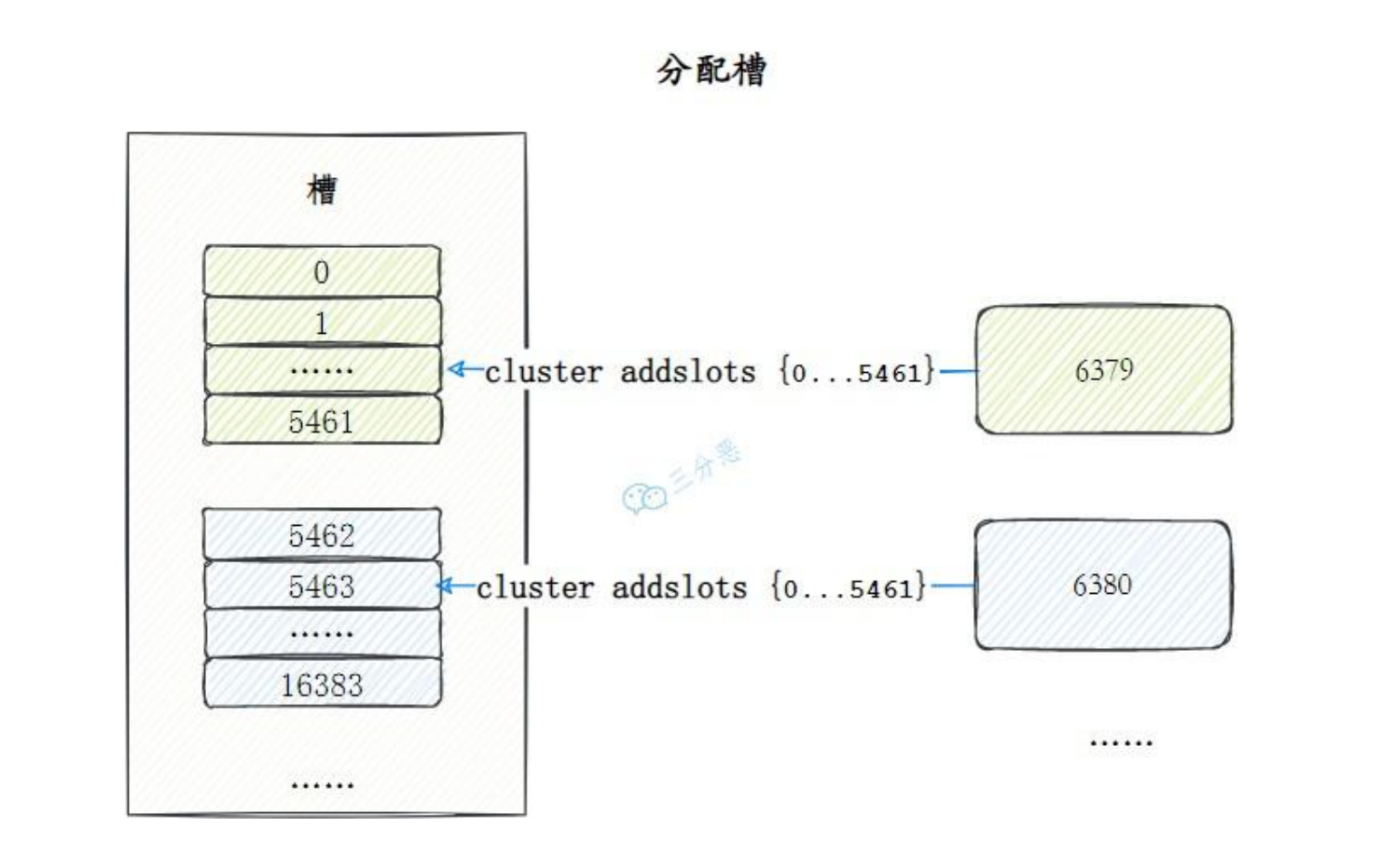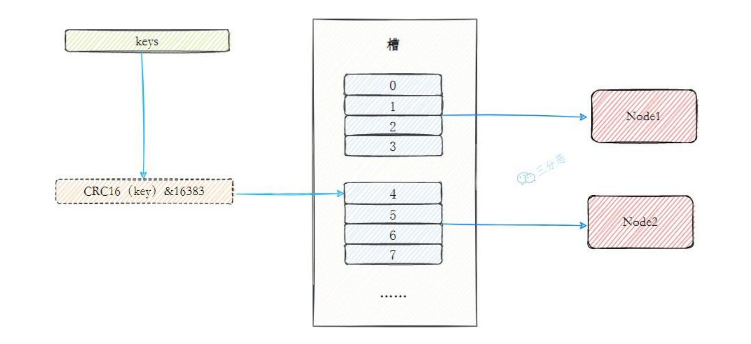 槽是介于数据和实际节点之间的虚拟概念,每个实际节点包含一定数量的槽,每个槽包含哈希值在一定范围内的数据