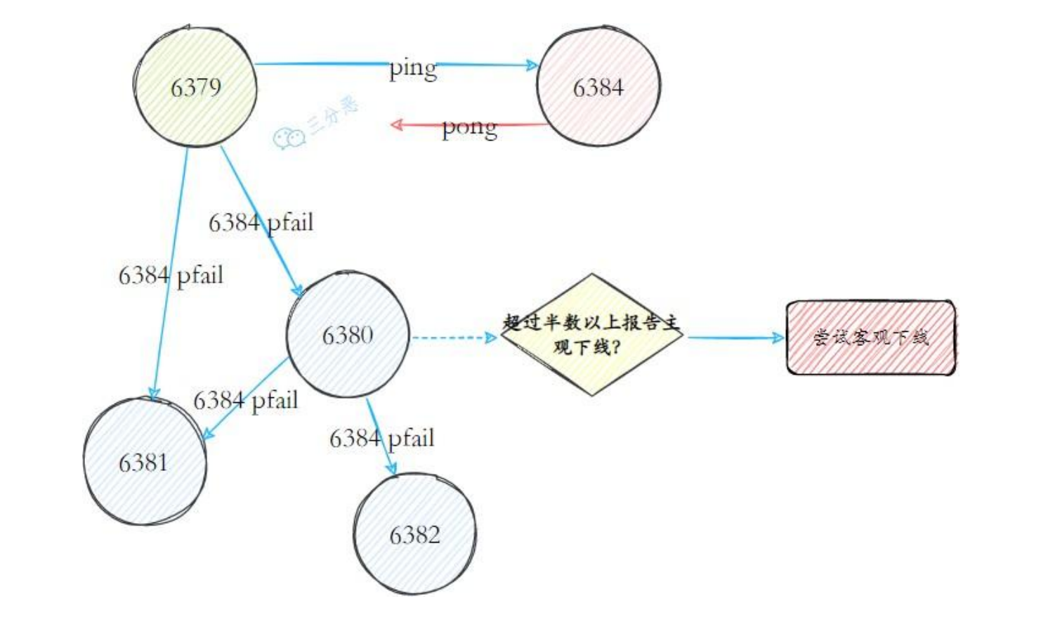 如果在cluster-node-timeout时间内通信一直失败,则发送节点会认为接收节点存在故障,把接收节点标记为主观下线(pfail)状态