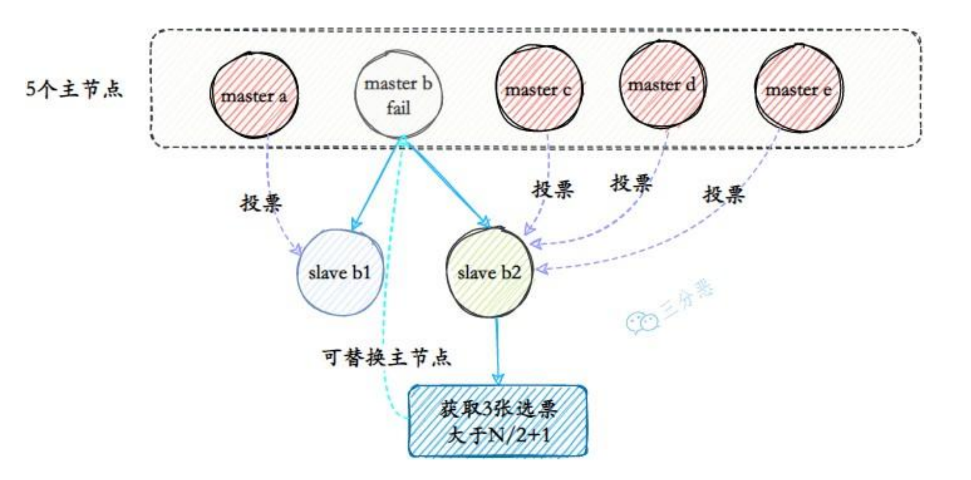 从节点收集投票,如果获得超过半数主节点的支持,则选举成功