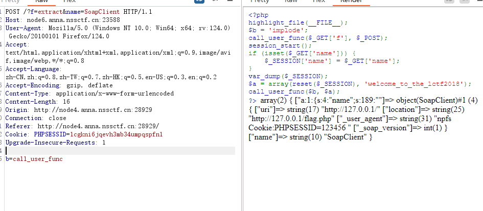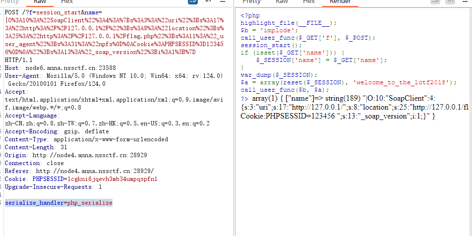 那么接下来的问题就是如何让b=call_user_func,在$b = 'implode';call_user_func($_GET['f'], $_POST);可以看到参数f可以控制,我们试图让其为extract来进行变量覆盖来达到我们的目的,那么f=extract&name=SoapClient,且post中提交b=call_user_func来达到目的,但是这还不够,要进行利用SoapClient来进行ssrf,我们还可以发现让f=session_start来达到控制session的目的,这里还涉及到了session反序列化,大概提一下。