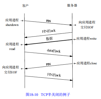 如果应用程序不调用c l o s e而调用s h u t d o w n,且第2个参数值为1,则插口的A P I支持半关闭。然而,大多数的应用程序通过调用close终止两个方向的连接。图1 8 - 1 0显示了一个半关闭的典型例子。让左方的客户端开始半关闭,当然也可以由另一端开始。开始的两个报文段和图1 8 - 4是相同的:初始端发出的 F I N,接着是另一端对这个 F I N的A C K报文段。但后面就和图1 8 - 4不同,因为接收半关闭的一方仍能发送数据。我们只显示一个数据报文段和一个A C K报文段,但可能发送了许多数据报文段(将在第 1 9章讨论数据报文段和确认报文段的交换)。当收到半关闭的一端在完成它的数据传送后,将发送一个F I N关闭这个方向的连接,这将传送一个文件结束符给发起这个半关闭的应用进程。当对第二个 F I N进行确认后,这个连接便彻底关闭了。