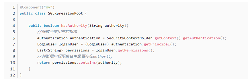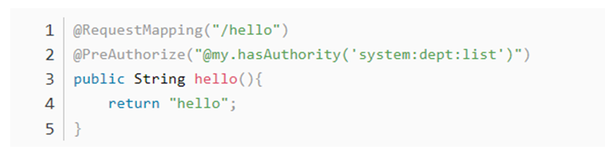 在SPEL表达式中使用 @my相当于获取容器中bean的名字为ex的对象。然后再调用这个对象的hasAuthority方法。