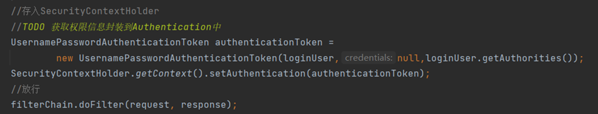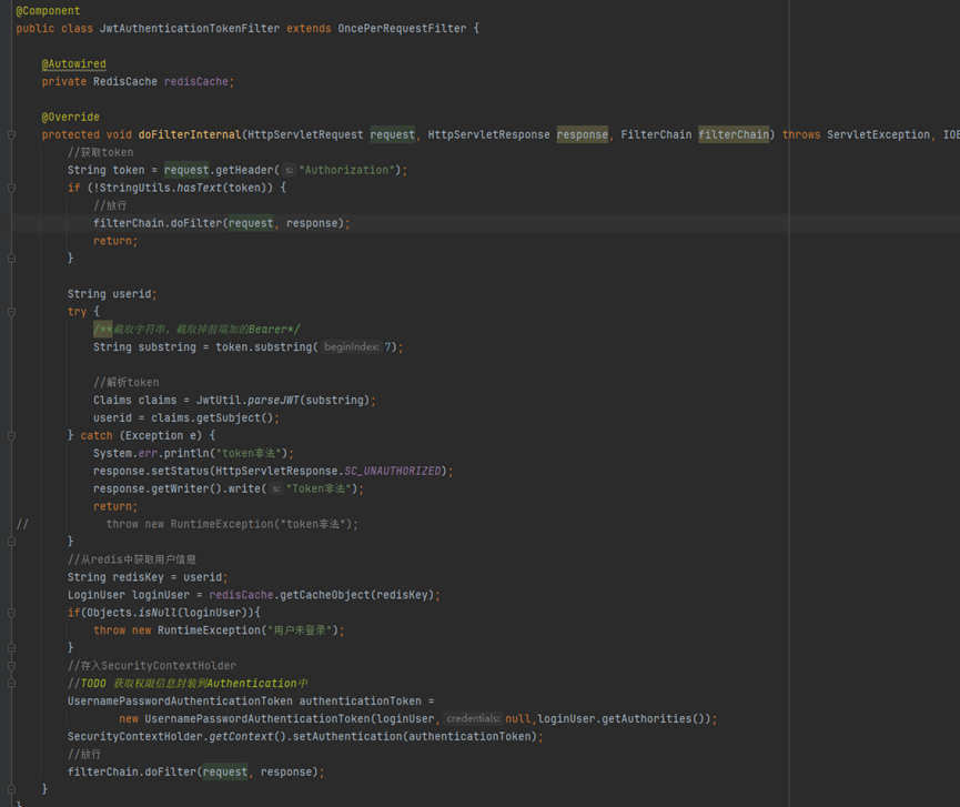 - 如果token合法就会进行解析,从redis中取到用户信息。再封装进authenticationToken中,后续可以通过securityContext拿到认证信息。再放行。