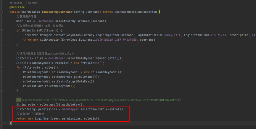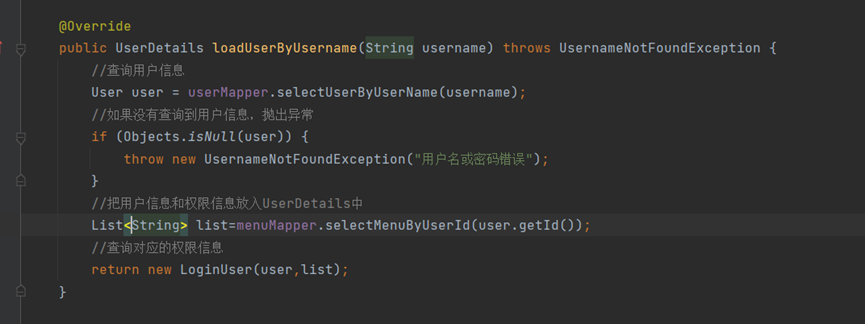 6.如果查到信息了再接着查用户的权限信息,返回权限信息到loginUser实体。