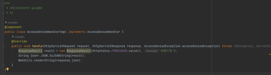 如果是授权过程中出现的异常会被封装成AccessDeniedException然后调用AccessDeniedHandler对象的方法去进行异常处理。