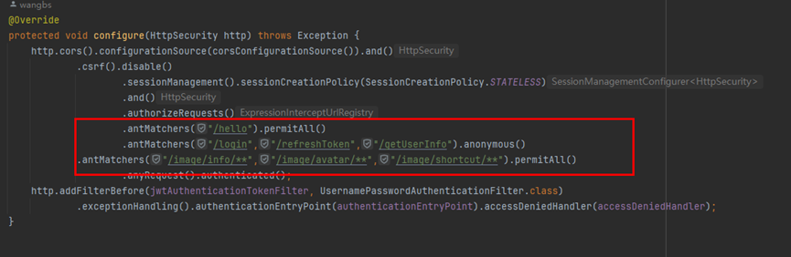 我们也可以在配置类中使用使用配置的方式对资源进行权限控制,但是这种方式用的并不多。但是有些地方,比如图片,访问图片不能也要写个方法去拿权限吧?登录也不能要权限吧?因为未登录都还没有进行认证授权。所以我们需要对某些资源进行白名单放行。