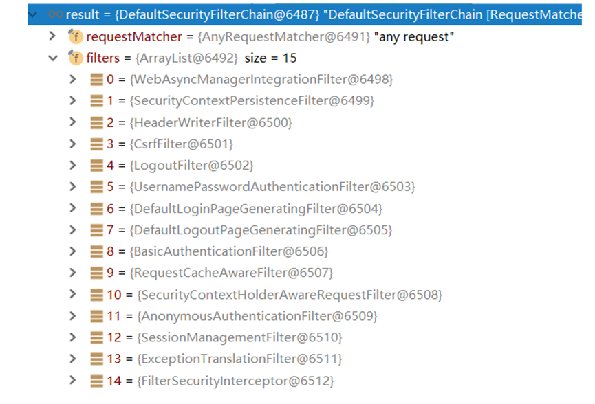 我们可以通过Debug查看当前系统中SpringSecurity过滤器链中有哪些过滤器及它们的顺序