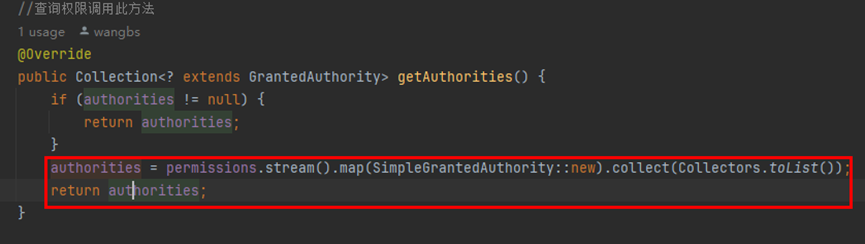 我们最终是要把permissions中的权限,转换为SimpleGrantedAuthority类型并封装到authorities中。