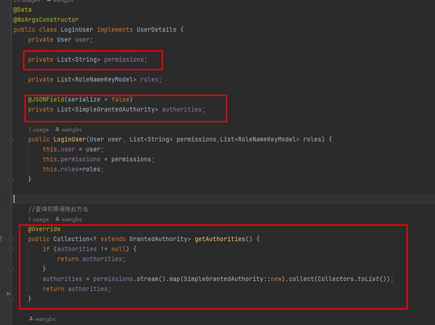 先查询到用户的权限信息,在通过LoginUser进行封装。传入permissions