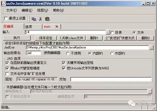 uuDeJava是Java Class文件的反编译工具。反编译的Java源程序被输出到Class的相同目录。内部使用jad.exe。反编译Class文件时,可以直接点击Class文件(关联后),或者选中文件或目录发送到uuDeJava的快捷方式。还可以拖动文件或目录到uuDeJava的主窗口。